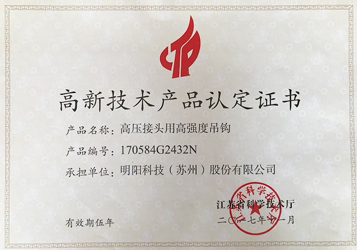 高壓接頭用高強度吊鉤高新技術產品認定證書